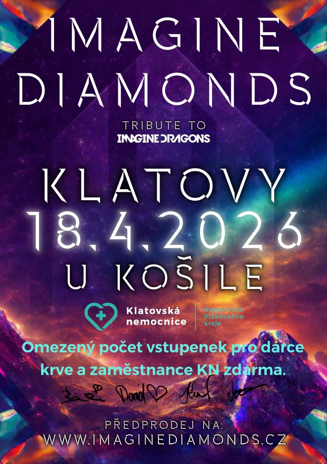 Plzeňská kapela IMAGINE DIAMONDS, která je zřejmě jediným českým tribute-bandem americké skupiny IMAGINE DRAGONS, vystoupí v sobotu 18. dubna v klatovském hudebním klubu U Košile. Na tento koncert nabízí bezplatně omezený počet vstupenek dárcům krve a zaměstnancům Klatovské nemocnice.